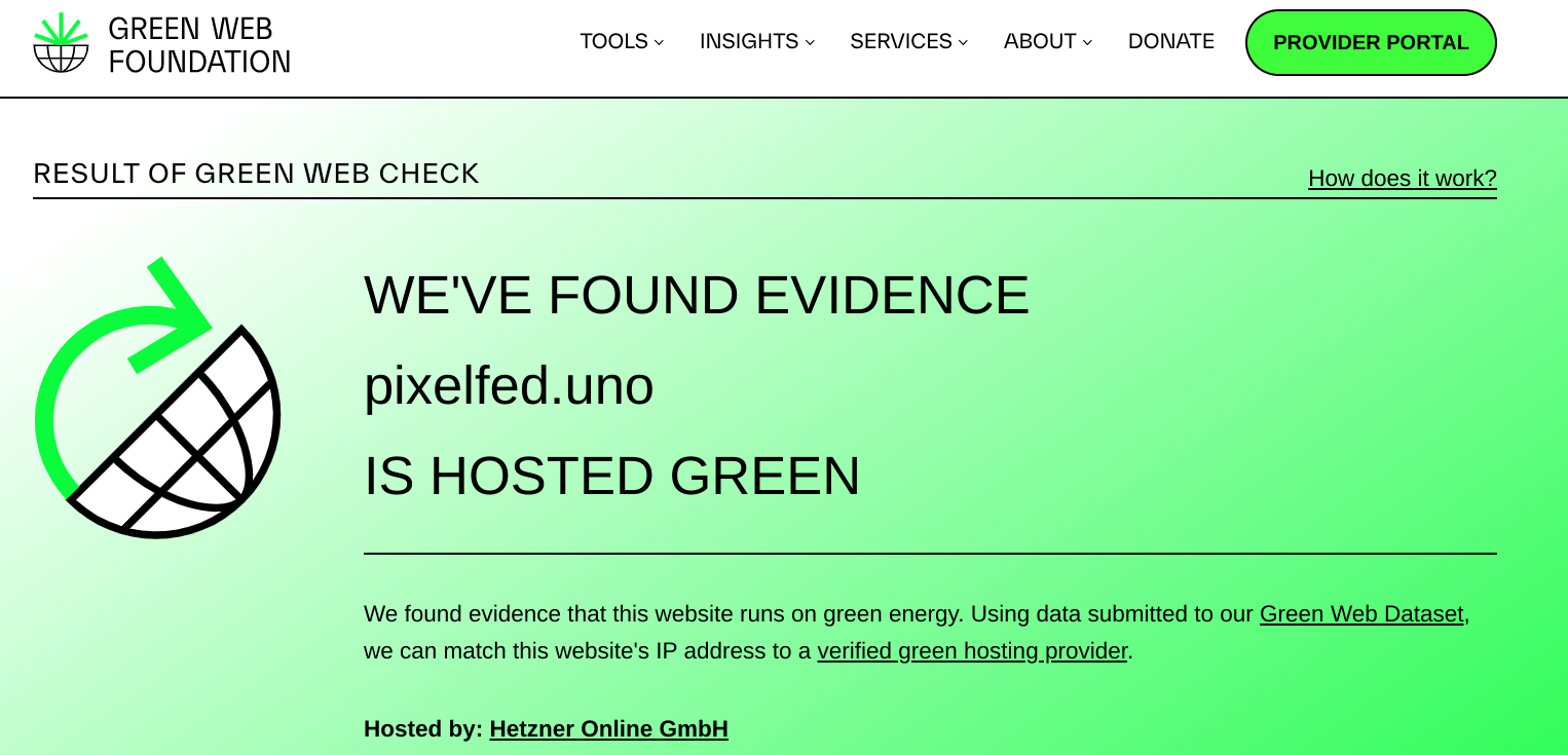 Un aspetto fondamentale che desideriamo sottolineare riguardo a pixelfed.uno è il nostro impegno verso la sostenibilità ambientale. Siamo orgogliosi di poter affermare che l'infrastruttura su cui si basa la nostra istanza è alimentata interamente da energia verde 🌱.